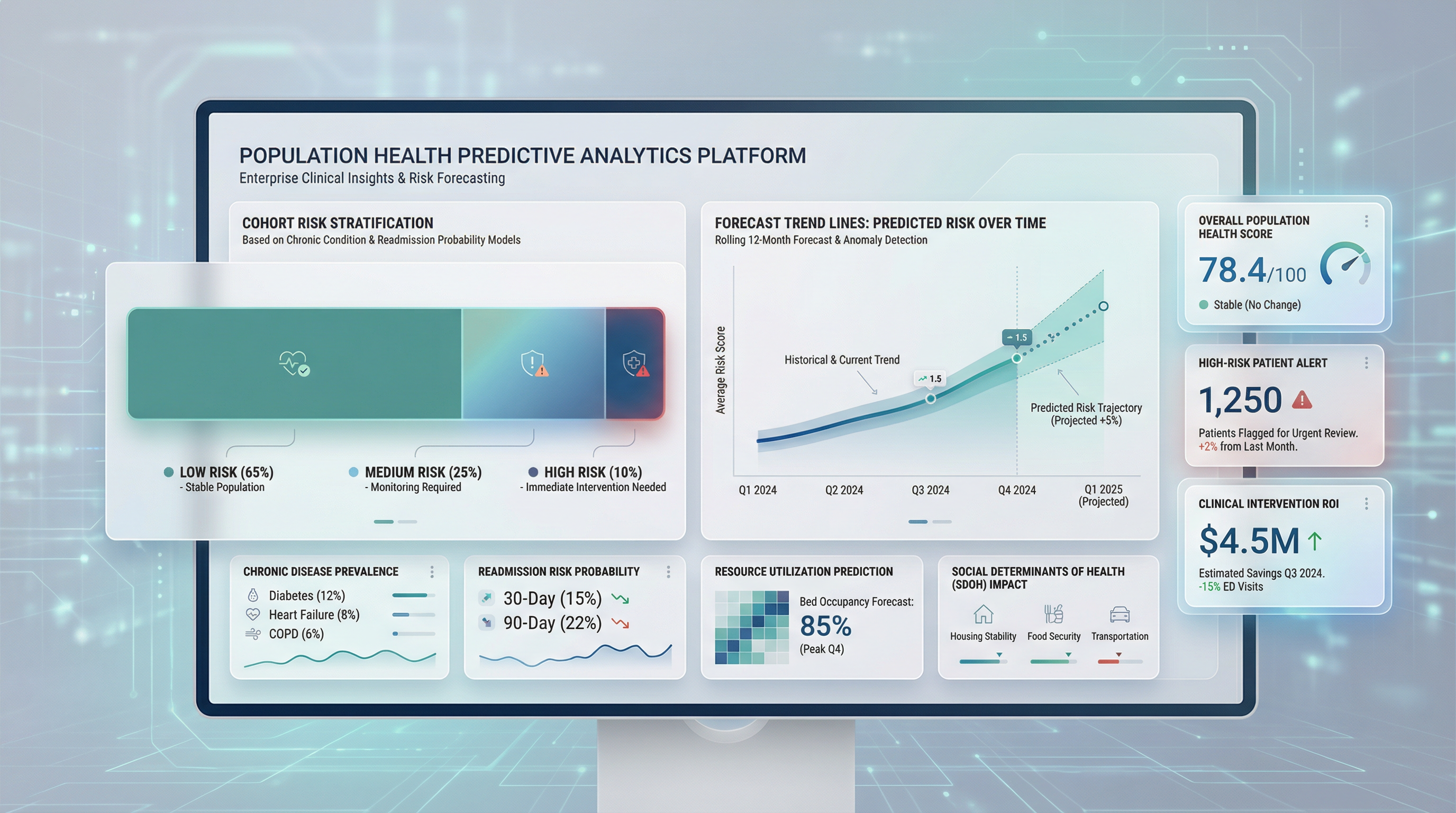 Predictive health infrastructure supporting early intervention and preventive care coordination.